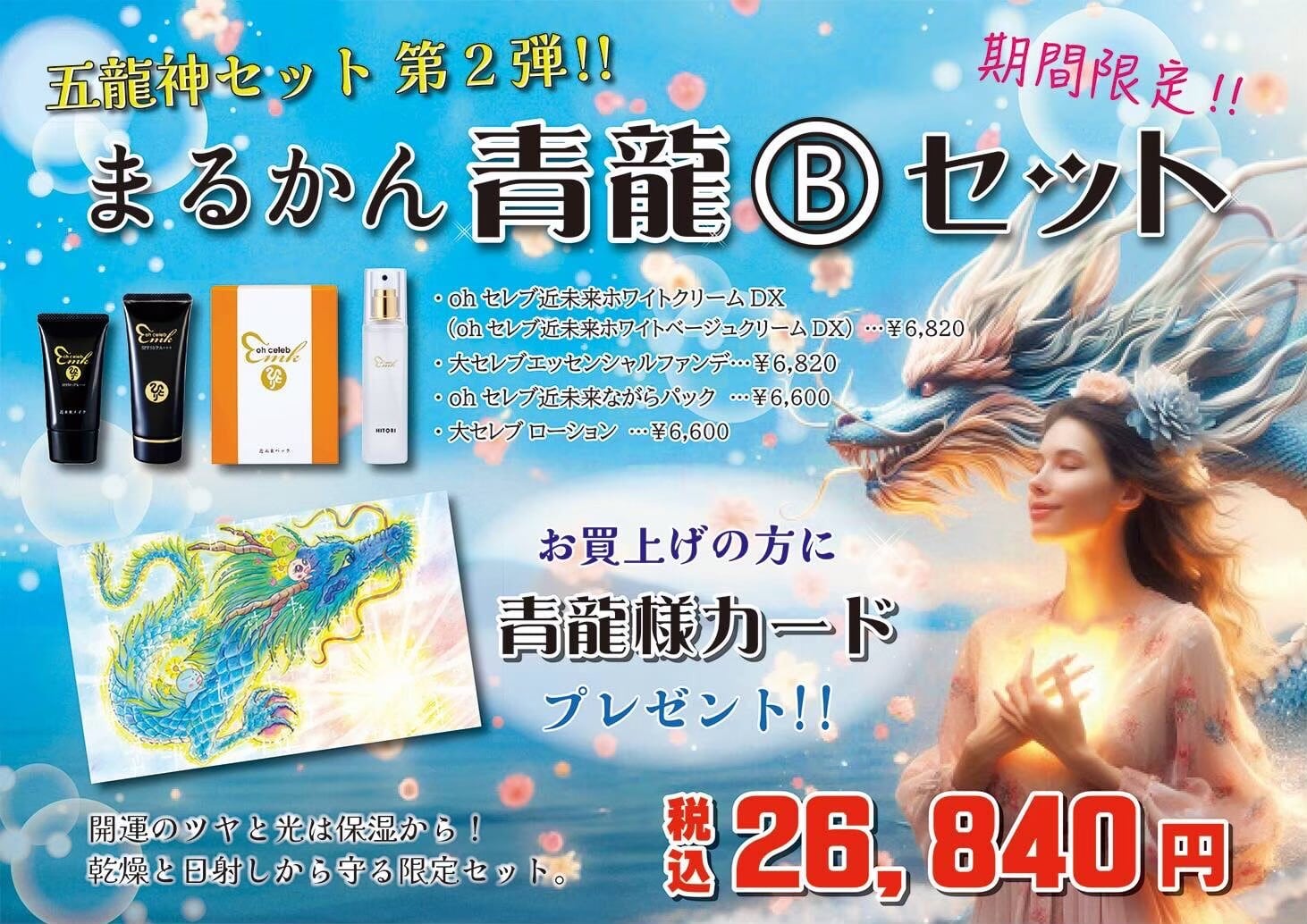 【青龍Bセット】<ホワイト(or ベージュ)クリームDX×1><エッセンシャルファンデ×1><ながらパック×1><大セレブ ローション×1> 【五龍神セット・第二弾】青龍様カード 大開運 柴村恵美子 期間限定